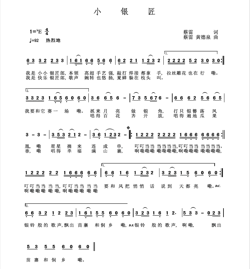《小银匠》以非物质文化遗产——银饰锻造技艺的传承为主题,从儿童视角借"打银簪""摘星辰"等奇幻情节展现匠人精神与艺术创造力。用"月亮作银角""星串随风语"等超现实意象编织童话意境,复沓的"叮叮当当"拟声词与"啊嘞嘞嘞"民族衬词交叠,形成银器锻打声与山歌调相融的韵律美。音乐上以贵州侗族大歌《五月蝉歌》等音乐元素为动机,在轻快跳跃的节奏中表现对民族工匠精神的童趣礼赞。